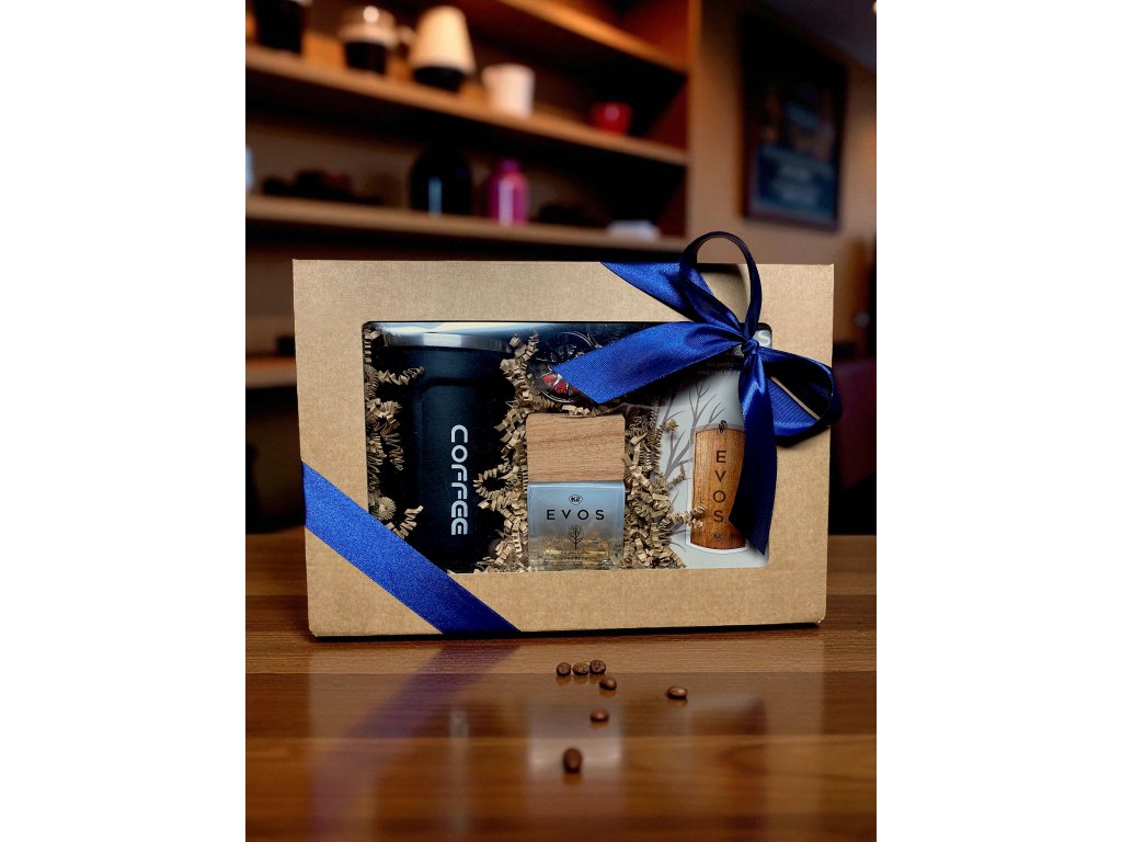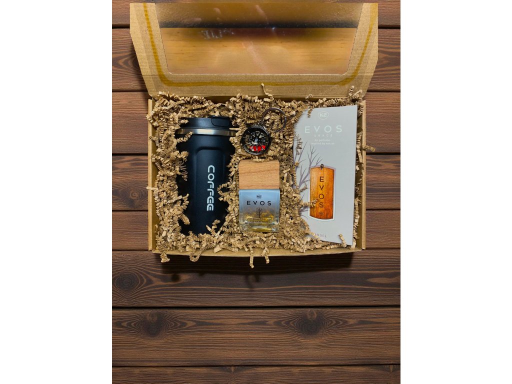 Luxusní dárková krabička pro muže – vůně do auta Evos Angel, elegantní termohrnek a stylový přívěšek kola. Ideální dárek pro milovníky aut a stylu.