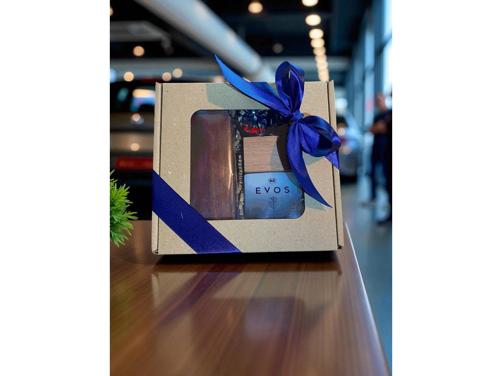 Stylová dárková krabička pro muže – vůně do auta Evos Angel a kovový přívěšek kola. Elegantní kombinace pro každého, kdo miluje vůni, styl a auta.