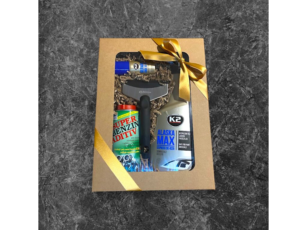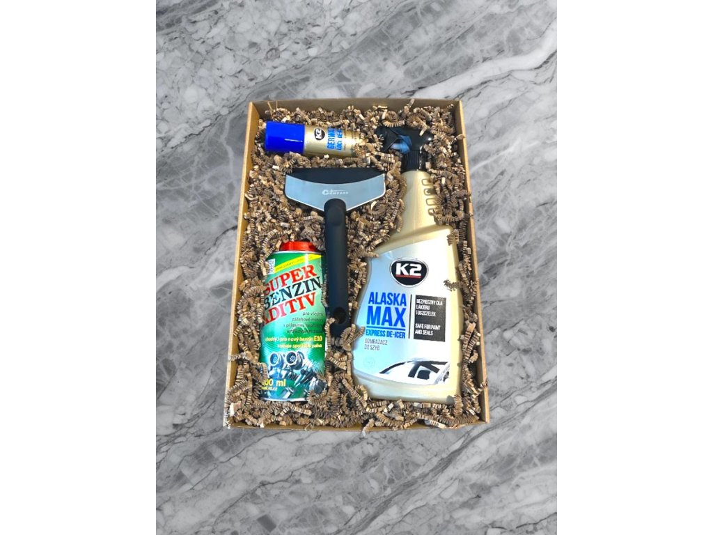 Praktická dárková zimní krabička pro benzínová auta obsahuje vše, co potřebujete do mrazů – aditivum do benzínu, rozmrazovač skel a zámků i škrabku. Ideální dárek pro každého motoristu. ❄️