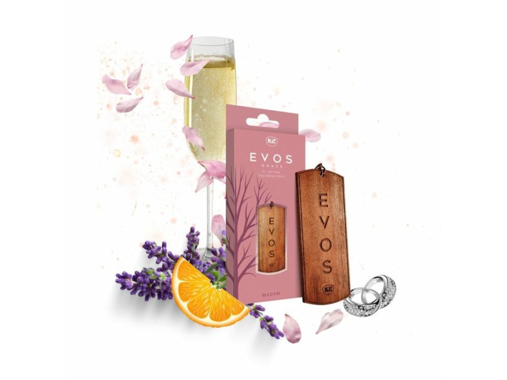 K2 EVOS Grace MADAM – dřevěný osvěžovač do auta s květinovou vůní pomeranče, levandule a ambry. Romantický šarm pro každou jízdu.