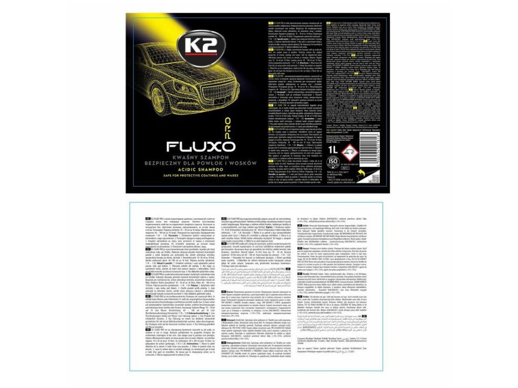 K2 Fluxo Pro je vysoce koncentrovaný, málo pěnivý šampon s kyselým pH (pH ~4), určený pro profesionální péči o automobily chráněné keramickými, křemennými nebo voskovými nátěry. Jeho jedinečné složení bez přísad účinně odstraňuje nečistoty, včetně minerálních usazenin, navrací nátěrům jejich původní hydrofobní vlastnosti a hloubkový lesk. Je ideální pro čištění laku před nanesením ochranných nátěrů.