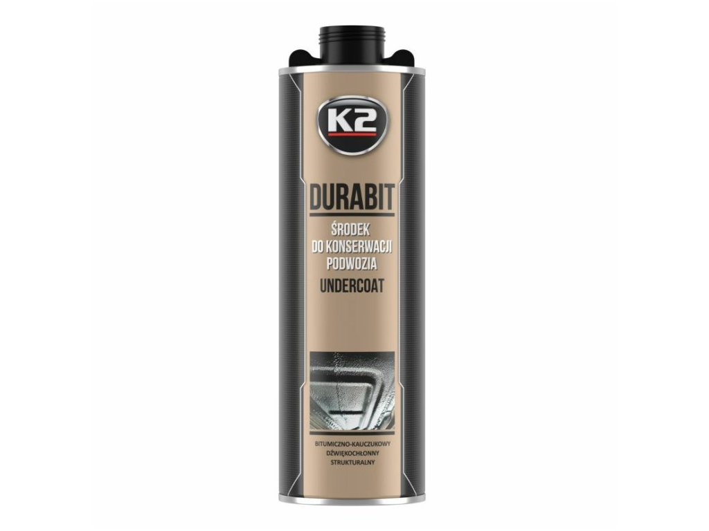 K2 DURABIT je odolný a účinný prostředek pro údržbu podvozku na bázi bitumenové pryže. Výrobek chrání podvozek a prahy před mechanickými faktory, jako je náraz kamene, voda, sůl. Má účinek pohlcující zvuk a vytváří výraznou strukturu.
