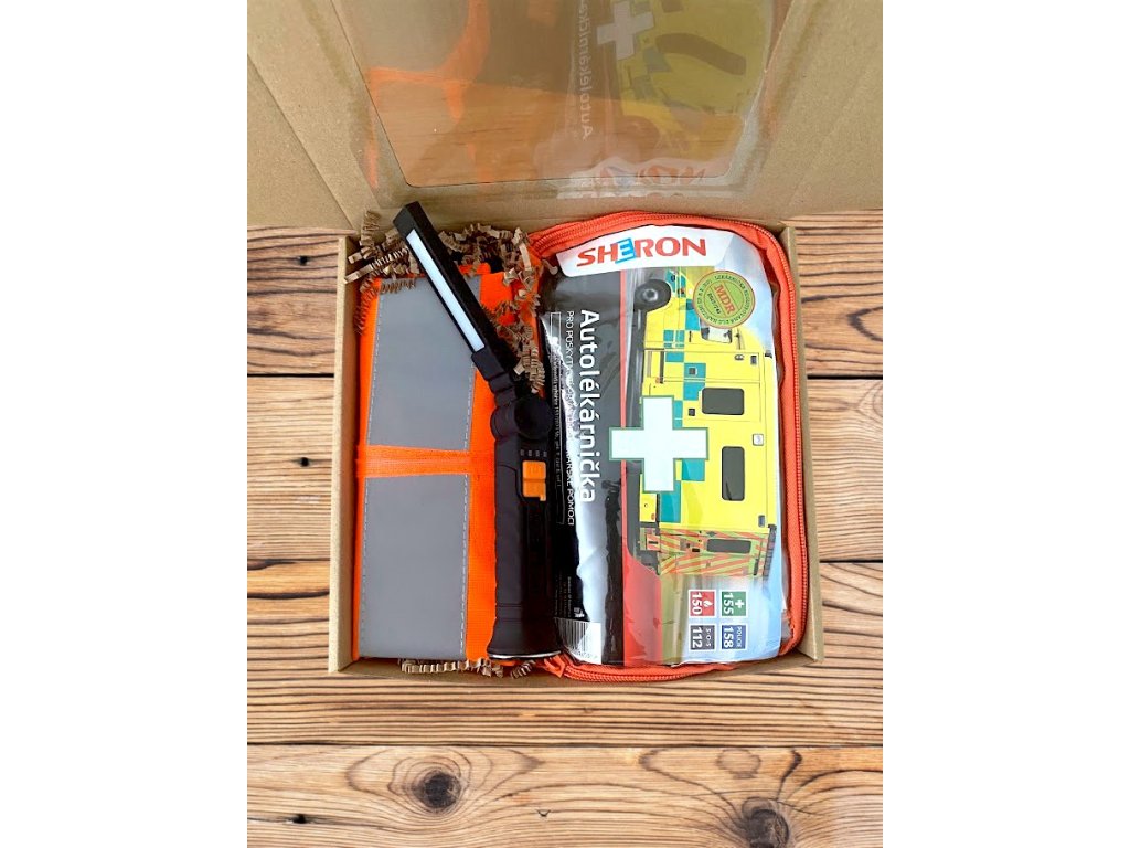 Tato praktická dárková krabička pro řidiče obsahuje vše potřebné pro nečekané situace na cestách: autolékárničku SHERON, reflexní vestu a svítilnu.