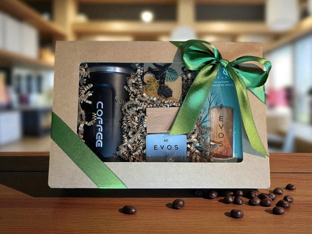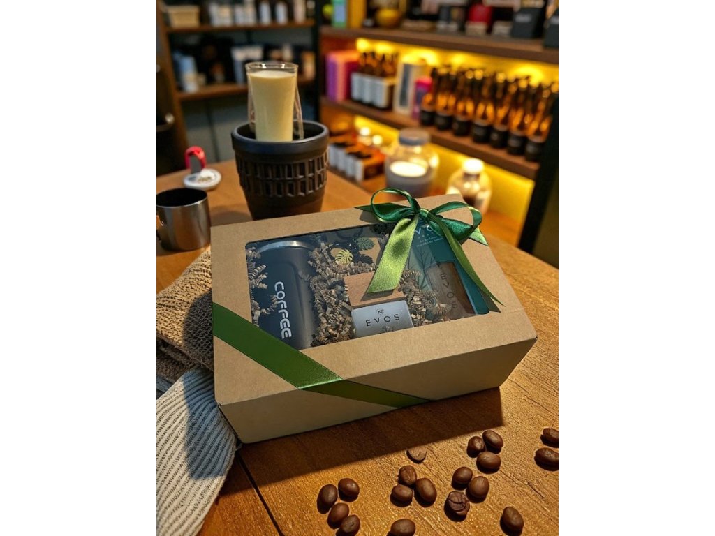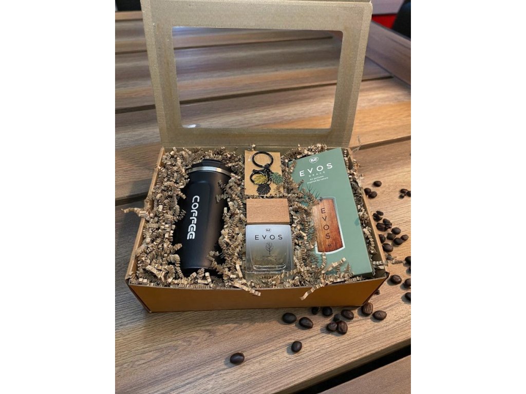 Přírodní dárková krabička plná vůní a pohody. Najdete v ní parfém EVOS - GAIA, vonné dřívko EVOS - GAIA, přívěšek a termohrnek – originální dárek pro každého, kdo miluje styl, vůně a relax. 🌿