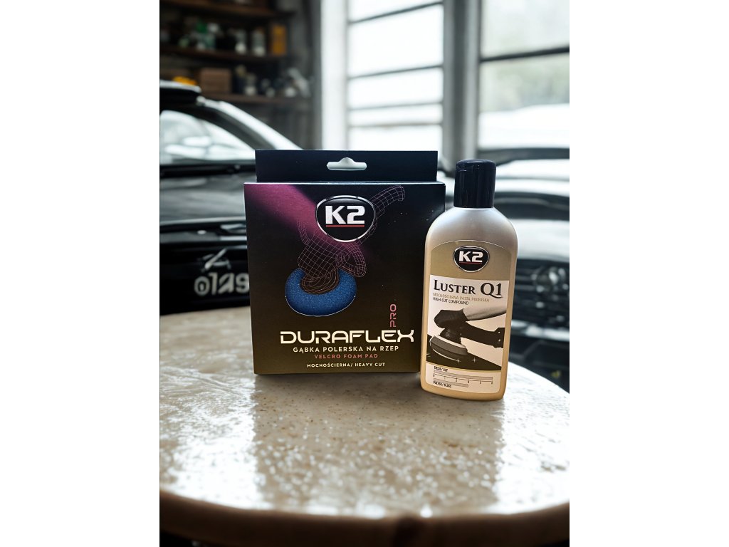 Sada pro leštění karoserie od značky K2. Obsahuje Luster Q1 250g pro dokonalý lesk a modrý molitanový kotouč K2 Duraflex pro efektivní aplikaci. Ideální pro odstranění jemných škrábanců a zvýšení lesku, vhodná pro ruční i strojní použití.