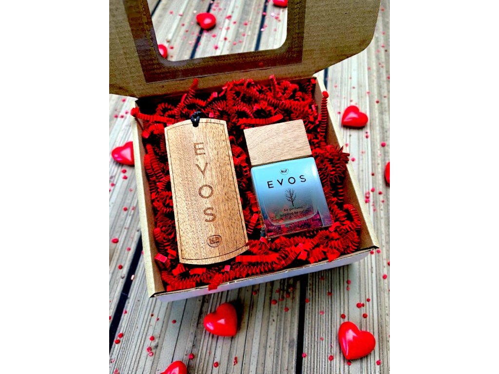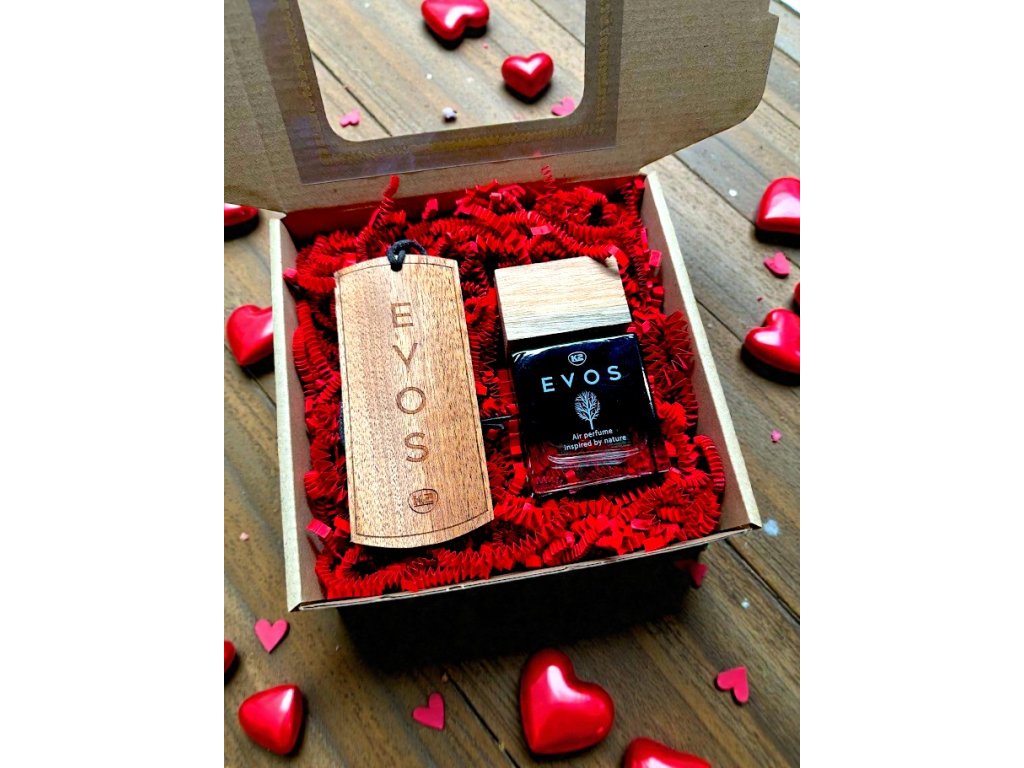Elegantní dárková krabička s vůní EVOS . Ideální dárek k Valentýnu pro každého, kdo miluje vůni čistoty v autě.